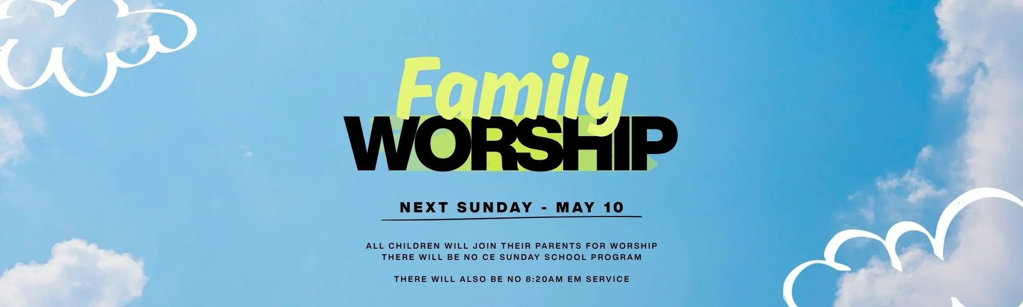 Please note that Sunday, May 10th will be a family worship service. All children will join their parents for worship. There will be no Sunday School program for children. There will also be no 8:20am service.