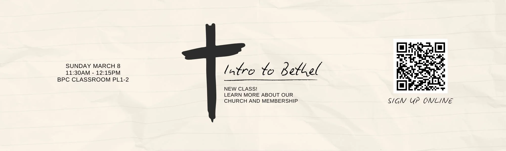 We are offering a new class three times a year for those who are interested in learning more about our church and about membership. The first class will be on Sunday, March 8. It's one 45-minute class where you can learn and ask questions about what it means to become a part of the Bethel church body. Please register online!