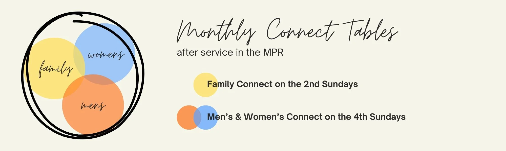 We know it can be hard to meet and get to know others at our church. The family ministry is hosting a Family Connect Table on the second Sunday of the month. The men’s and women's ministries are hosting Connect Tables on the fourth Sunday of the month. So join us in the MPR after service!