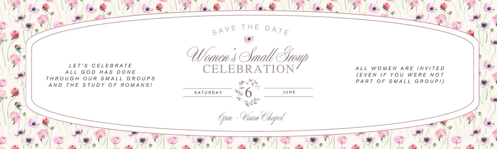 Ladies - save the date! All women are invited for this special dinner celebrating all God has done in our small groups and reflecting our study of Romans. All women are invited - even if you were not able to participate in small group.